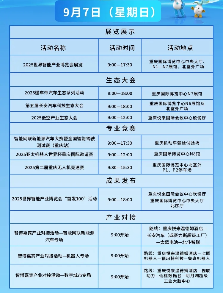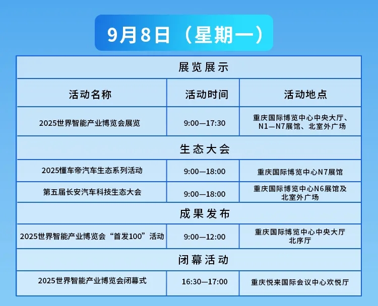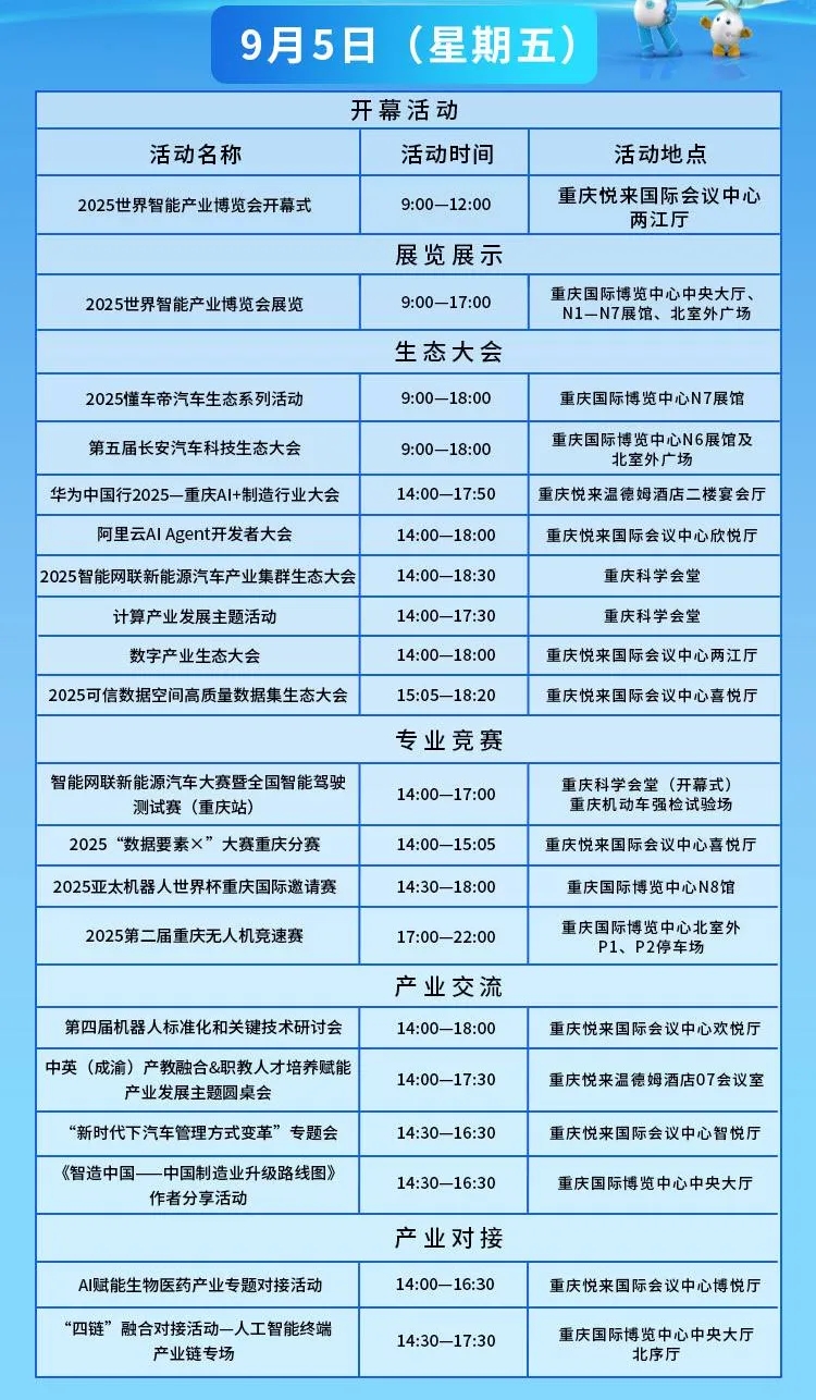 2025世界智能产业博览会将于9月5日至8日在位于两江新区的重庆国际博览中心重庆悦来国际会议中心盛大举行。本届智博会以人工智能为核心,聚焦“人工智能+”和“智能网联新能源汽车”两大年度主题。精心打造五大前沿板块,智能网联新能源汽车、数字城市、智能机器人、智能居家、低空经济。活动日程安排出炉,一起来看。