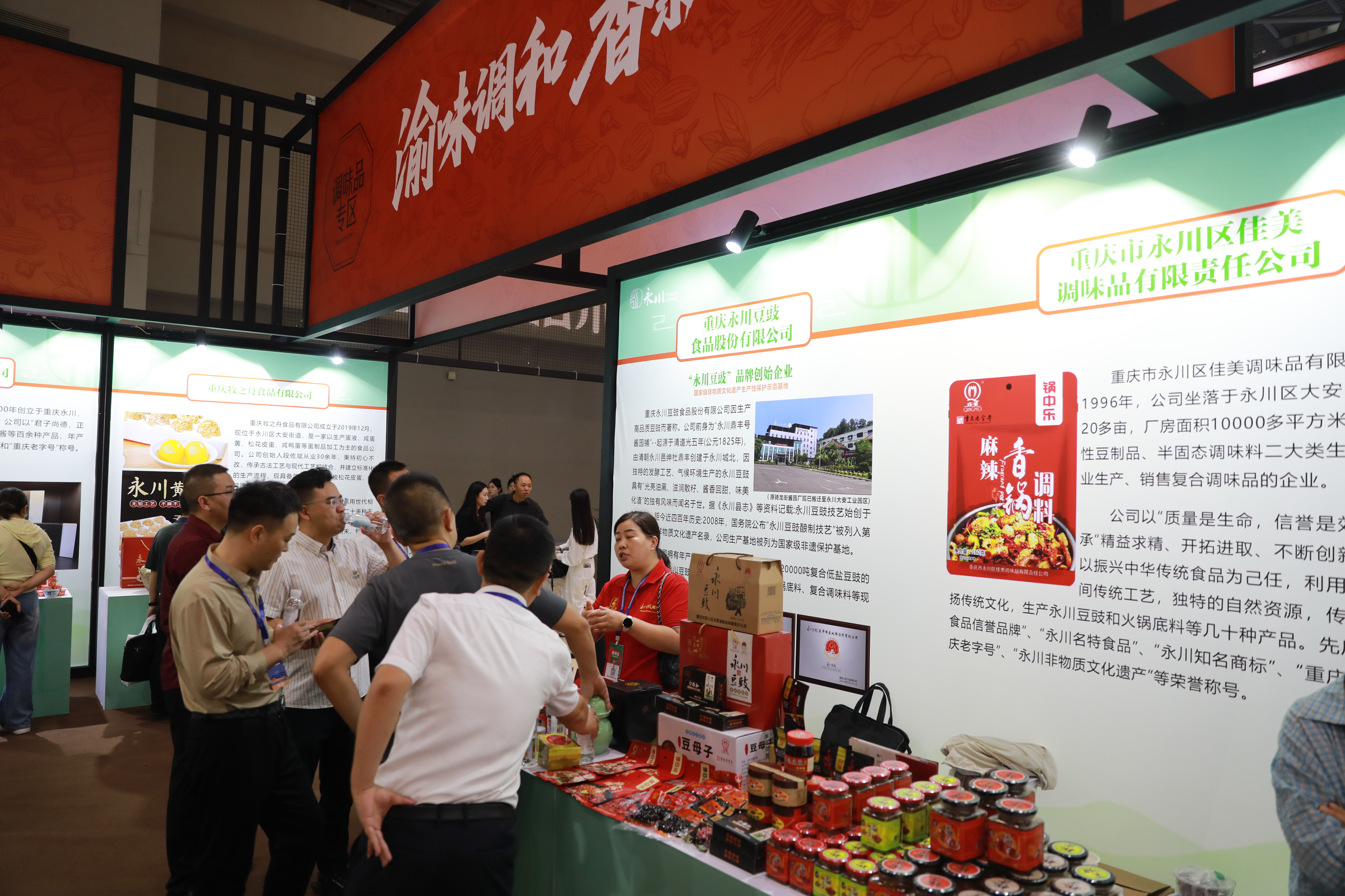走进永川展馆,展厅中央核心展区聚焦永川调味品产品,不仅重点展示了“王牌”产品永川豆豉,还汇聚了饭巢火锅底料、崔婆婆系列产品、来苏红豆腐、仁义腌腊制品、俏表嫂大头菜、哄饭饭萝卜干、朱沱酱油、简大姐烧椒酱等众多特色产品,让市民直观感受“永川味道”的独特魅力。