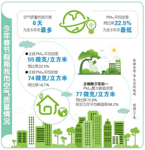 2月11日,重庆日报记者从市生态环境局获悉,今年春节长假期间(2月4日至10日),我市在气象扩散条件较差、降水偏少情况下,空气质量明显好于往年同期,空气质量优良天数达到6天,为近5年来最多;PM2.5平均浓度同比下降22.5%,为近5年来最低。