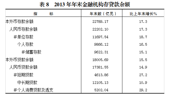 全市金融业实现增加值1068.35亿元,比上年增长15.6%,占全市生产总值的8.4%。共有地方法人金融机构40家,非地方法人金融机构44家。年末全市金融机构本外币存款余额为22789.17亿元,比上年末增长17.3%。其中,人民币储蓄存款余额9622.31亿元,增长15.1%。金融机构本外币贷款余额为18005.69亿元,比上年末增长15.5%。其中,个人消费贷款及透支5202.04亿元,增长29.2%。