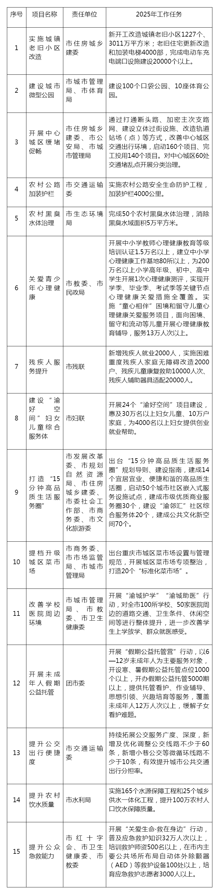 近日,《重庆市2025年重点民生实事工作目标任务》已正式印发,一起来看看今年重庆的15件重点民生实事安排了哪些目标任务?