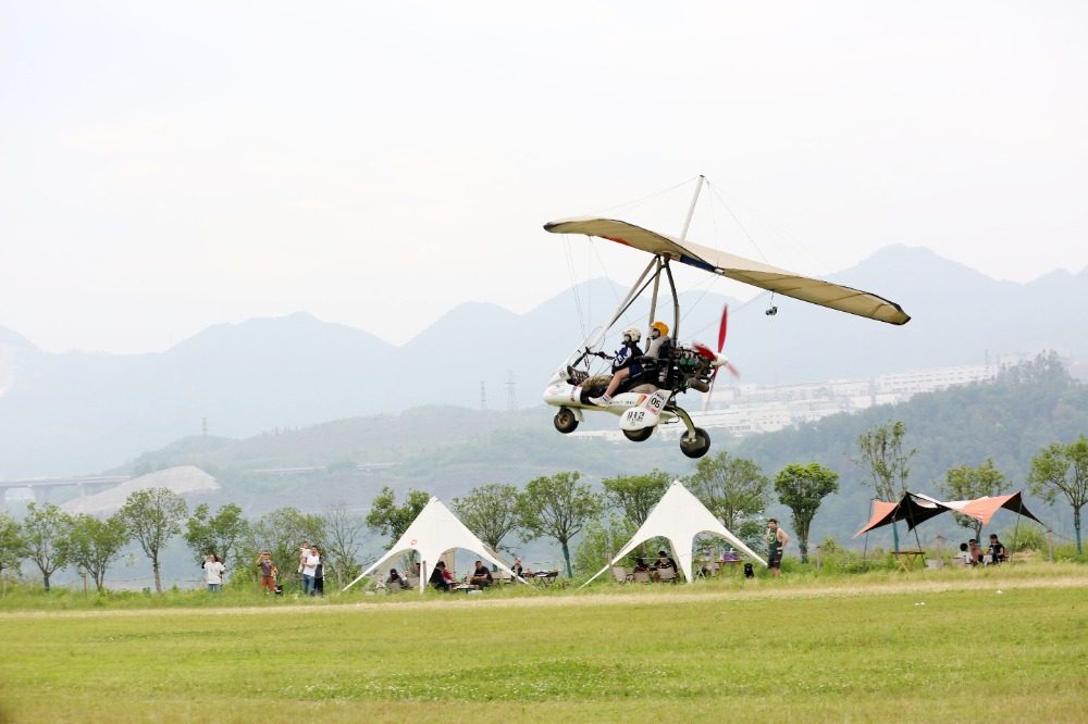 巴南区天盟航空飞行基地,运动爱好者正在体验动力三角翼飞行。