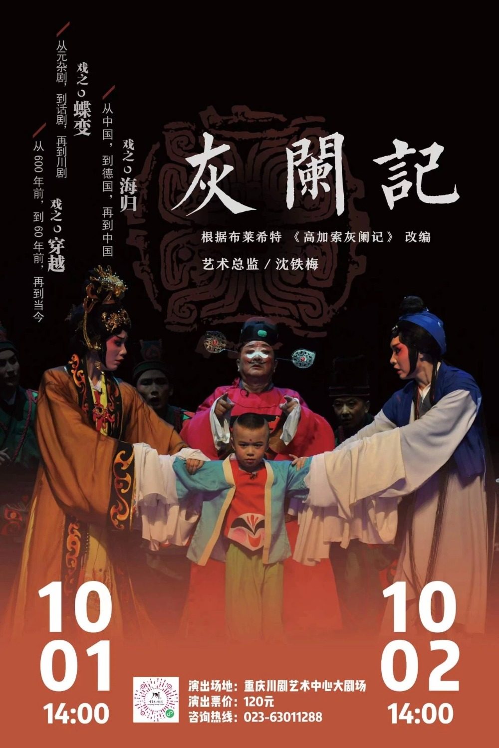 大幕戏和折子戏的演出时间为每天下午2点。其中,10月1日-2日将演出高腔戏《灰阑记》。该剧改编自德国戏剧家布莱希特创作的《高加索灰阑记》,讲述了郡王府的丫环杜鹃在战乱时收留了被遗弃的郡王小公子,并在3年后与郡王夫人展开了一场夺子之战……该剧由著名川剧表演艺术家、“三度梅”得主沈铁梅担任艺术总监,情节跌宕起伏,唱腔优美。值得一提的是,即将上演的这个版本,将由沈铁梅学生、优秀青年演员白孟迪领衔主演,她将为这出经典大戏带来青春的诠释。