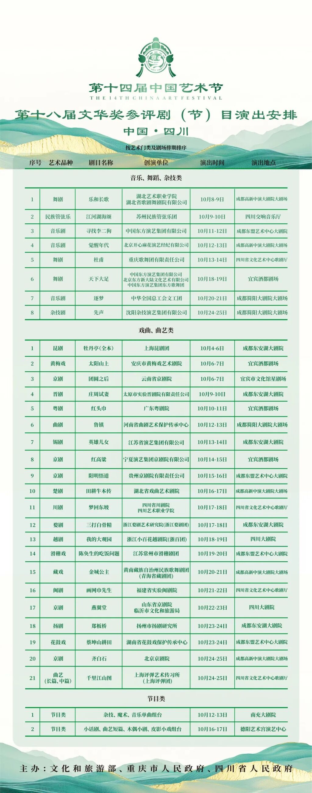第十四届中国艺术节将在重庆与四川两地联袂举办。作为全国规格最高、规模最大、最具影响力的综合性文化艺术活动,本届艺术节以“艺动巴山蜀水 共绘时代新篇”为主题,由文化和旅游部、重庆市人民政府、四川省人民政府共同主办。