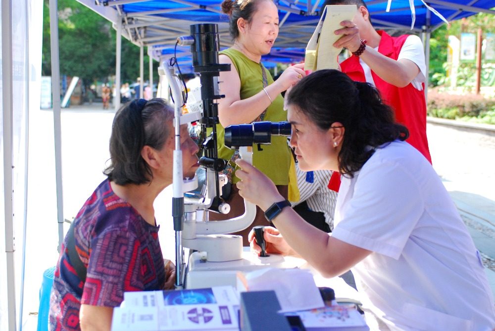 在健康义诊服务区,医务人员为市民进行眼部健康检查。