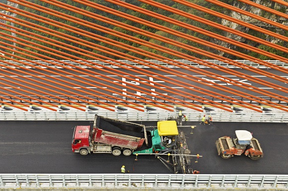 工人们正在对桥面进行泥清路面铺设。通讯员 赵勇 摄