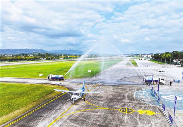 11月11日,梁平机场,一架货运通用航空飞机在“过水门”,随后将飞往湖北荆门漳河机场,标志着重庆首条低空货运航线正式开通。