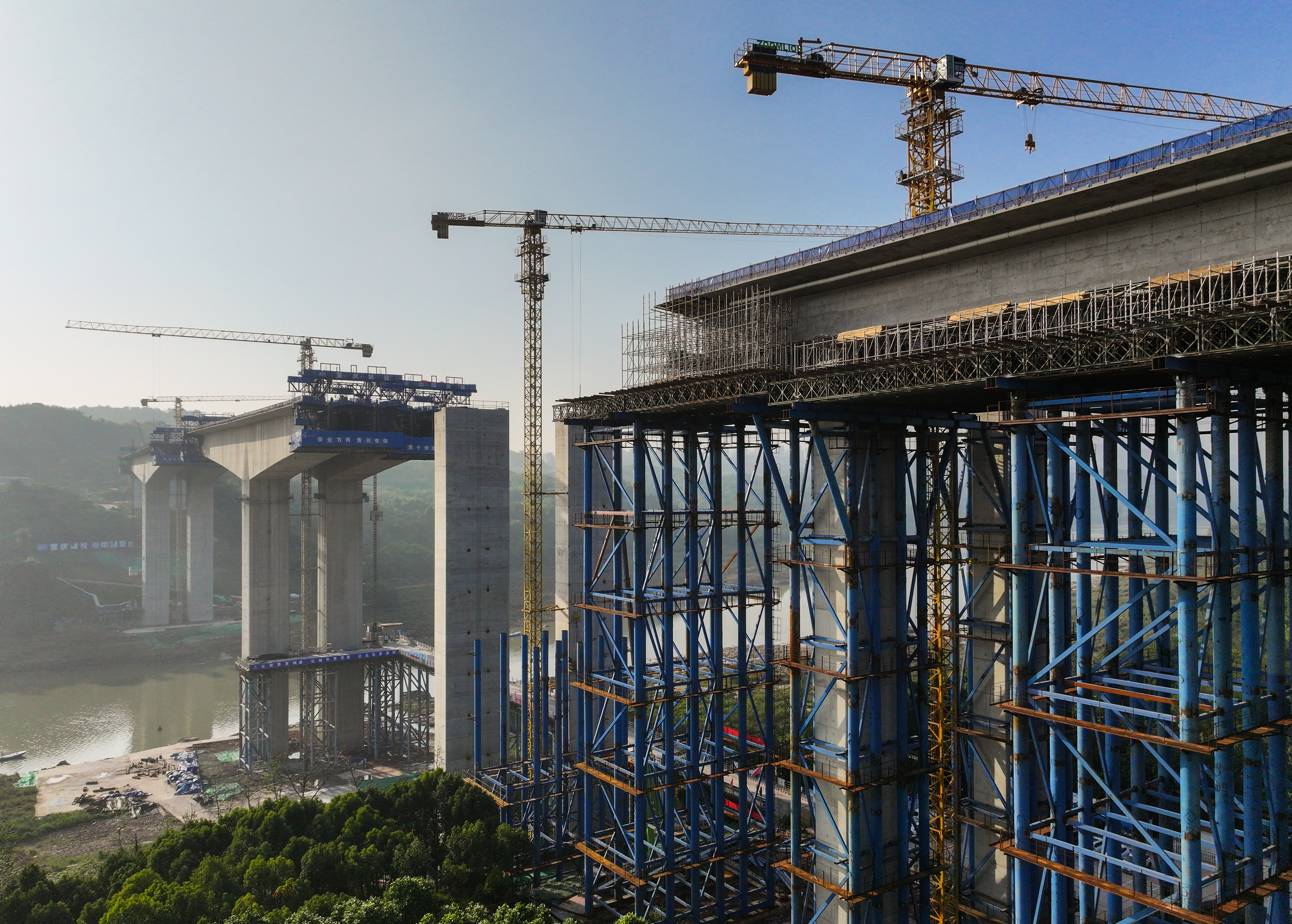 11月25日,重庆宝山嘉陵江大桥项目建设现场,数台塔吊挥动吊臂(无人机照片)。首席记者 龙帆 摄