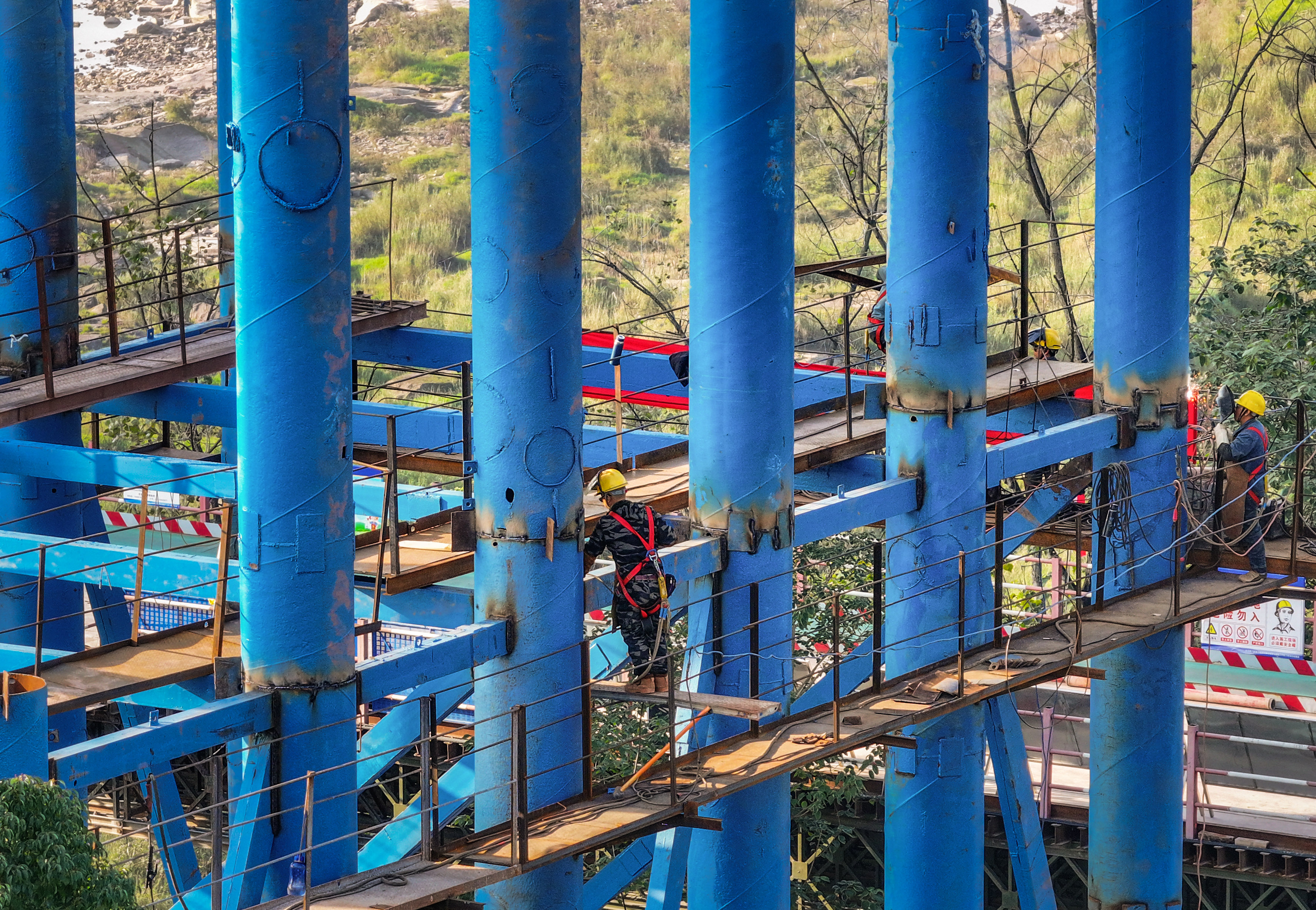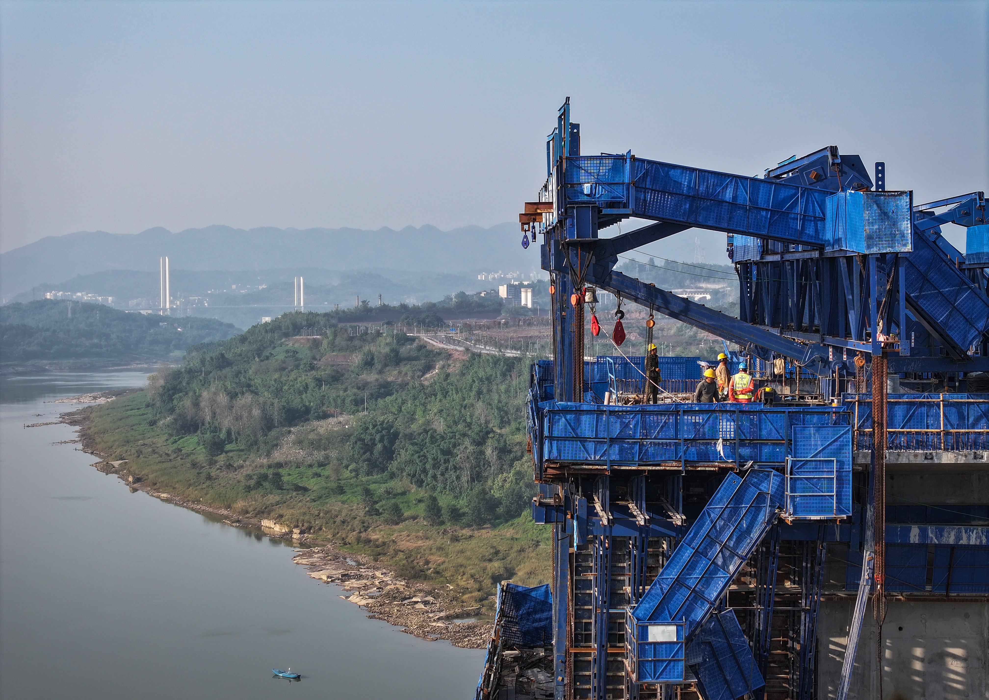 11月25日,重庆宝山嘉陵江大桥项目建设现场,工人正在加紧作业。首席记者 龙帆 摄