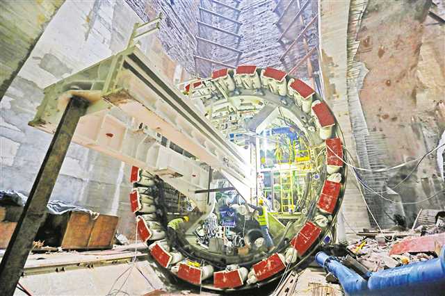 我市轨道交通首条穿江隧道建设又有新进展——10月12日,重庆轨道交通27号线重庆站—南滨路站区间左线盾构机“渝江号”中盾下部顺利首吊入井,开启井下设备调试。