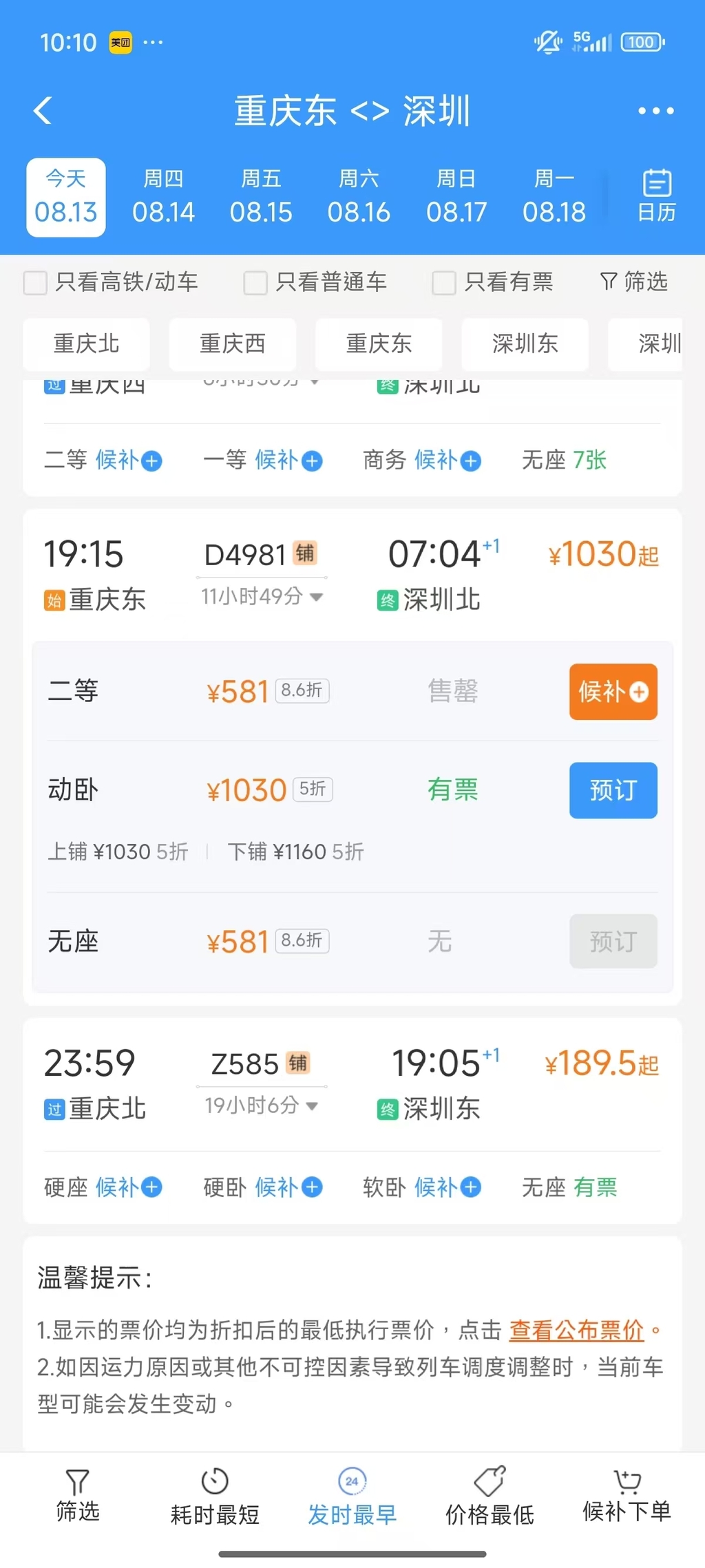 通过“铁路12306”APP查询到,重庆东到深圳北(D4981次)动卧列车实行五折优惠票价,上铺票价为1030元,下铺票价为1160元,相比传统出行方式,动卧列车不仅帮助旅客节省住宿费用,其舒适的车厢环境更能让旅客得到充分休息,以更好的精神状态迎接新一天的行程。