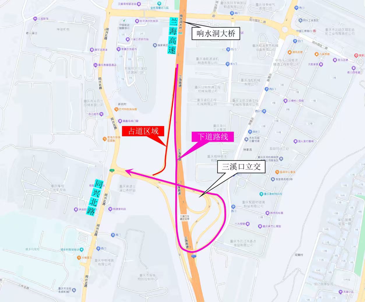 据了解,本次封闭及交通转换路段为G75渝武高速三溪口立交(进城方向)至同兴北路下道匝道,将原有下道口前移,经新建上跨渝武主线匝道桥后下道。