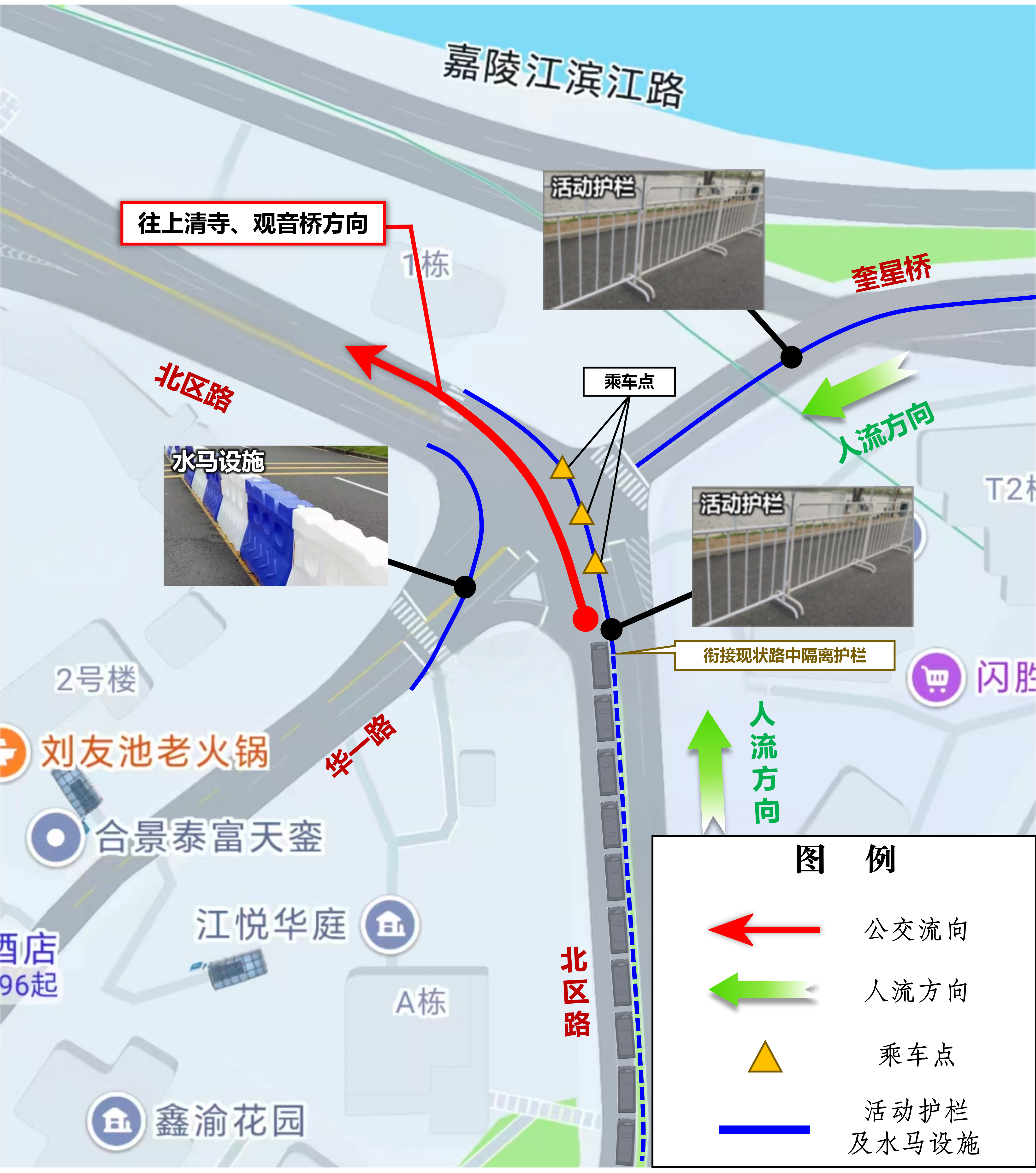 ④北区路一号桥路口:前往上清寺、两江新区(观音桥)方向乘车点;