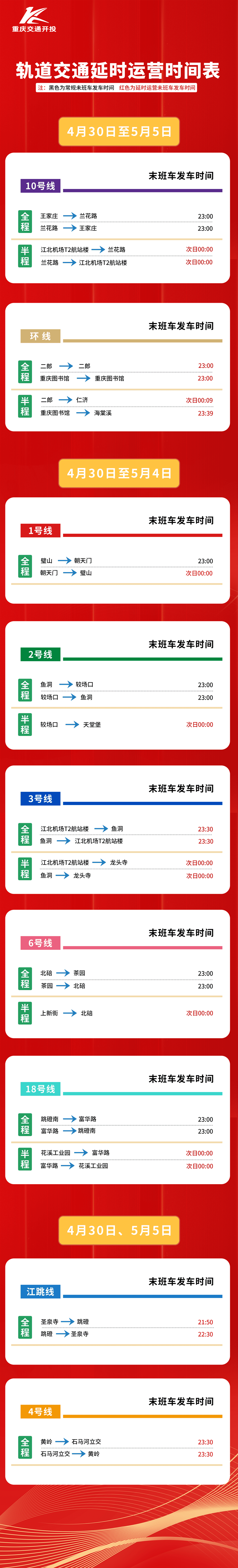4月30日、5月5日,4号线全线延时30分钟,江跳线圣泉寺至跳磴方向延时40分钟、跳磴至圣泉寺方向延时1小时。