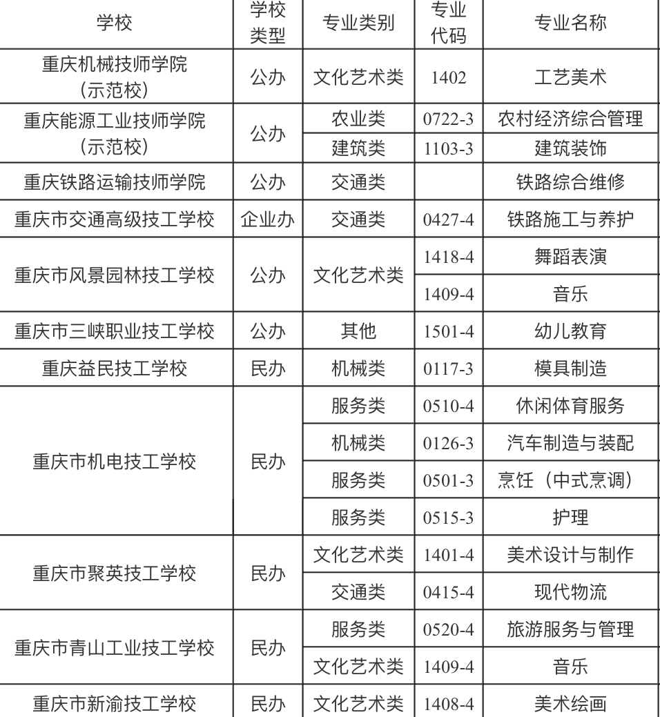 华龙网-新重庆客户端记者看到,新增专业类别包括文化艺术类、农业类、建筑类、交通类、机械类、服务类等。具体专业包括工业美术、农村经济综合管理、铁路施工与防护、体育休闲服务、现代物流等。