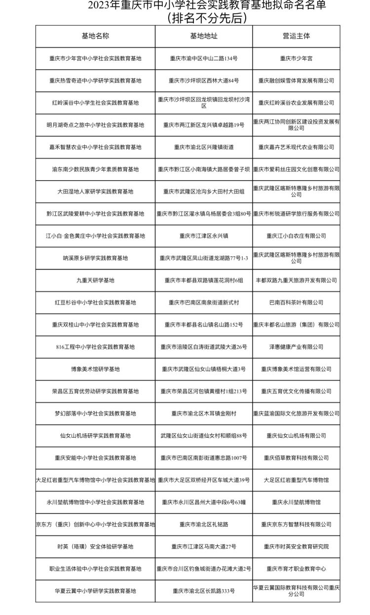 此外,还有黔江区、武隆区、江津区等多个区县的中小学社会实践教育基地入选。