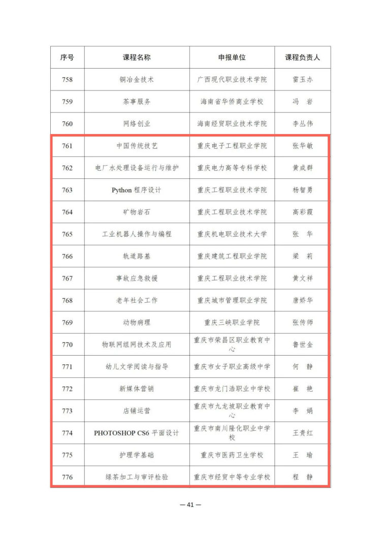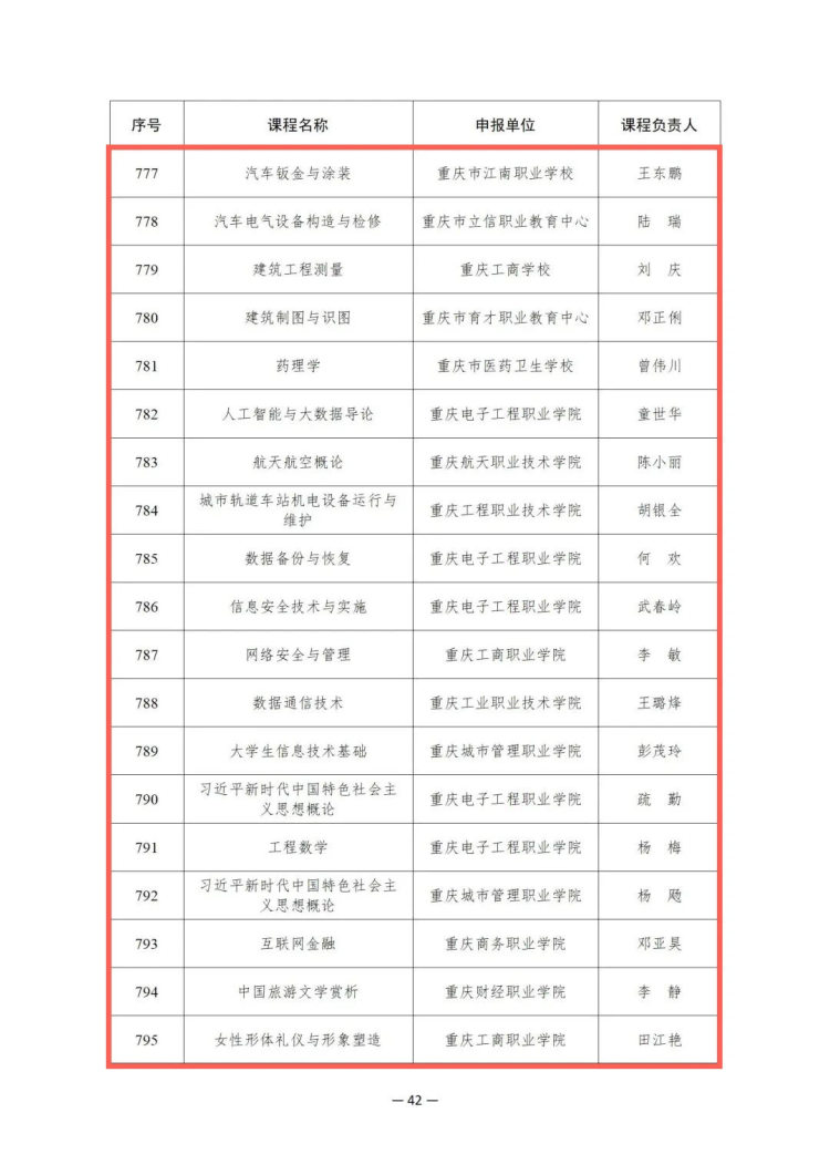 52门精品课程包含重庆电子工程职业学院的中国传统技艺、人工智能与大数据导论、数据备份与恢复、信息安全技术与实施等,重庆工商职业学院的网络安全与管理、女性形体礼仪与形象塑造、建筑室内手绘效果图等,重庆电力高等专科学校的电厂水处理设备运行与维护,重庆机电职业技术大学的工业机器人操作与编程,重庆建筑工程职业学院的轨道路基等。