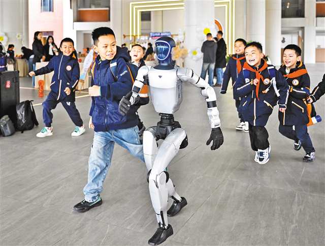 3月4日,两江新区重光小学校,孩子们和机器人“赛跑”。记者 张锦辉 摄/视觉重庆