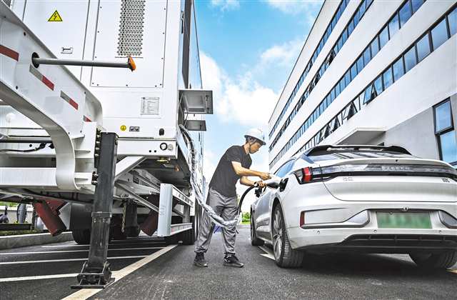 重庆高新区清安能源智慧零碳产业园区,工作人员在演示用交直流一体化充放电移动储能系统给新能源车充电。(资料图片)首席记者 龙帆 摄/视觉重庆