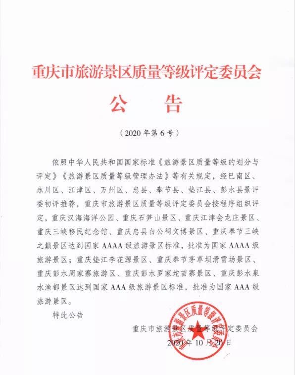第1眼-重庆广电消息,依照中华人民共和国国家标准《旅游景区质量等级的划分与评定》《旅游景区质量等级管理办法》等有关规定,经重庆市旅游景区质量等级评定委员会按程序组织评定,重庆汉海海洋公园、重庆石笋山景区、重庆江津会龙庄景区、重庆三峡移民纪念馆、重庆忠县白公祠文博景区、重庆奉节三峡之巅景区达到国家AAAA级旅游景区标准,批准为国家AAAA级旅游景区。