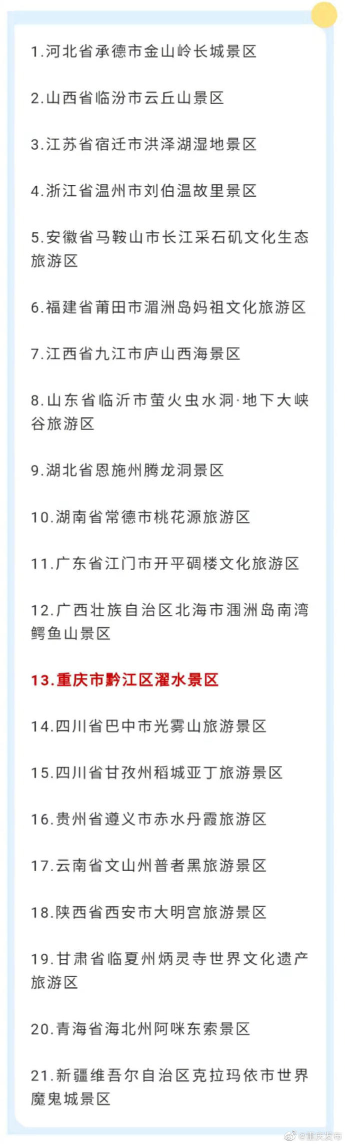 @重庆发布消息,近日,文化和旅游部网站发布公示,根据中华人民共和国国家标准《旅游景区质量等级的划分与评定》和《旅游景区质量等级管理办法》,经有关省(区、市)文化和旅游行政部门推荐,文化和旅游部按程序组织综合评定,以下21家旅游景区达到国家5A级旅游景区标准要求,拟确定为国家5A级旅游景区,现予公示。其中,重庆市黔江区濯水景区入选。
