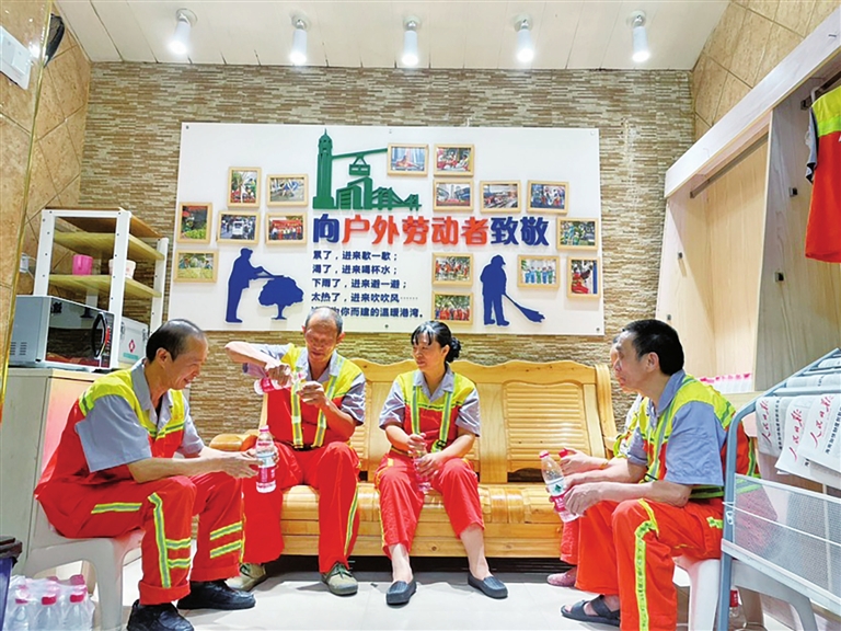“天气太热了,上完早上的保洁班,中午大家就可以轮流来这里休息乘凉,喝口水缓一下,还是很不错。”环卫工人符勤说。