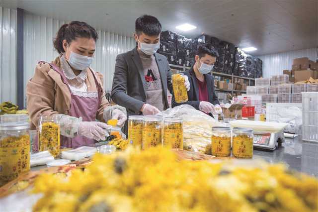 秀山县隘口镇电商扶贫产业园电商物流分发中心,工作人员正在打包金丝皇菊准备发货 摄/齐岚森