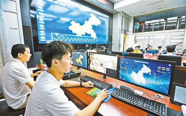 6月15日,市应急管理局指挥中心,工作人员通过大数据对森林、江河、道路交通等进行安全巡查。特约摄影 钟志兵\视觉重庆