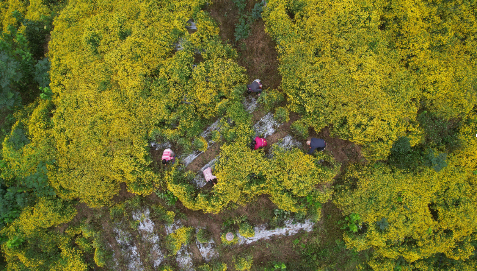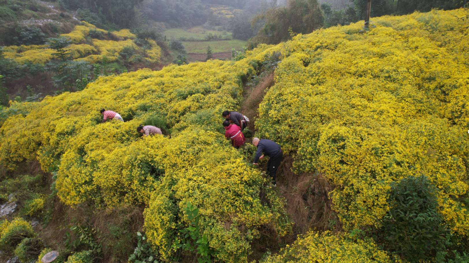 采收季里,村民们忙碌并快乐着。“大家记到,要的是杆杆上面50厘米左右,不要留长了,也不能太短了。”肖在为成了最早的受益者,他种植的一亩多野菊花,已全部采收并被郭晗全数收购,“当天采收当天变现,一亩多山坡收入3000多元。明年我要多种几亩。”