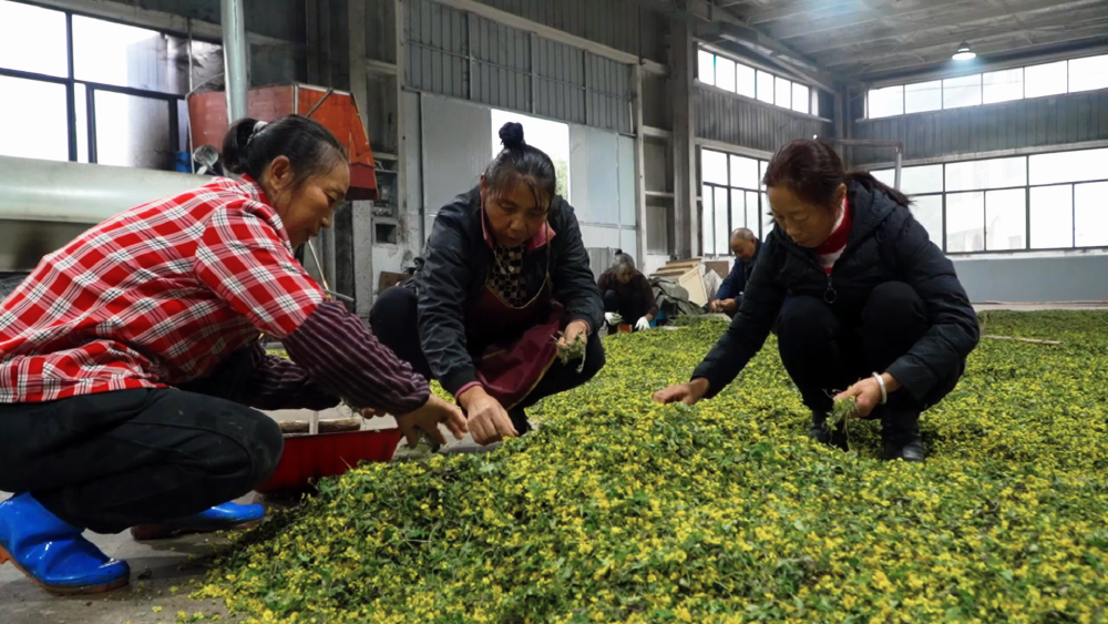 铜梁区安溪镇金滩村野菊花加工厂,村民正在分拣野菊花。