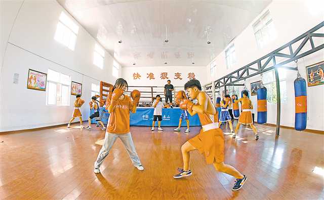 9月4日,黔江区沙坝镇中心校,学生们在标准化拳击馆里进行一对一的拳击训练。