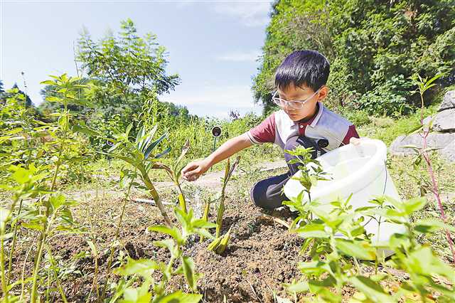 9月1日,南川区马嘴实验学校,一学生正给名贵的中草药铁皮石斛松土施肥。