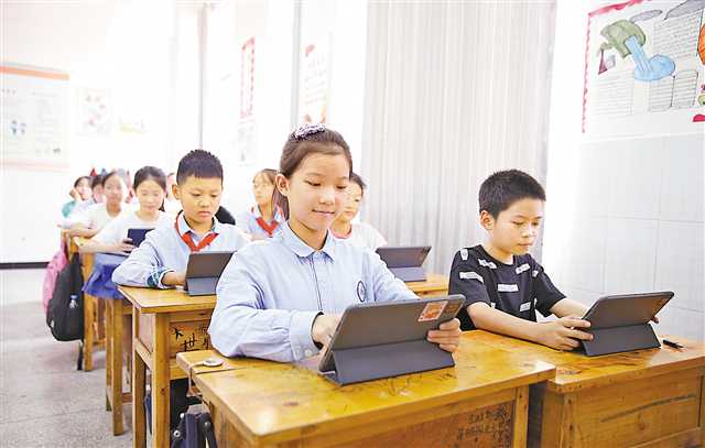 9月1日,垫江县桂北小学,学生们正熟练地运用平板电脑查找相关资料,完成老师布置的课堂作业。