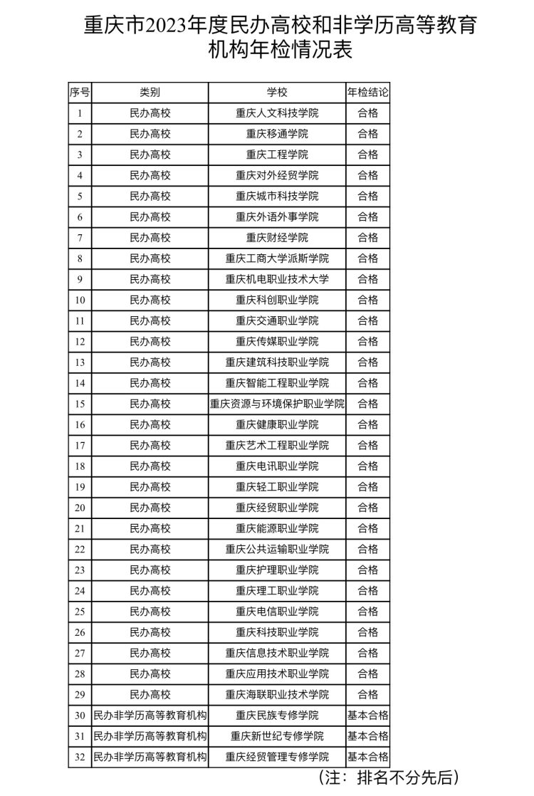 根据国家和重庆市有关规定,市教委已完成全市民办高校、民办非学历高等教育机构2023年度办学情况检查,综合专家检查、日常管理考核等情况评定,重庆人文科技学院等29所民办高校年检结论为“合格”,重庆民族专修学院等3所民办非学历高等教育机构年检结论为“基本合格”。