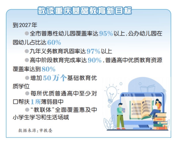 在供给机制变革方面,到2027年,全市普惠性幼儿园覆盖率达95%以上,公办幼儿园在园幼儿占比达60%;九年义务教育巩固率达97%以上;高中阶段教育完成率达90%,普通高中优质教育资源覆盖率达到80%;增加50万个基础教育优质学位;有序扩大免费教育范围,办好必要的乡村“小而特、小而优、小而美、小而精、小而强”小规模学校。
