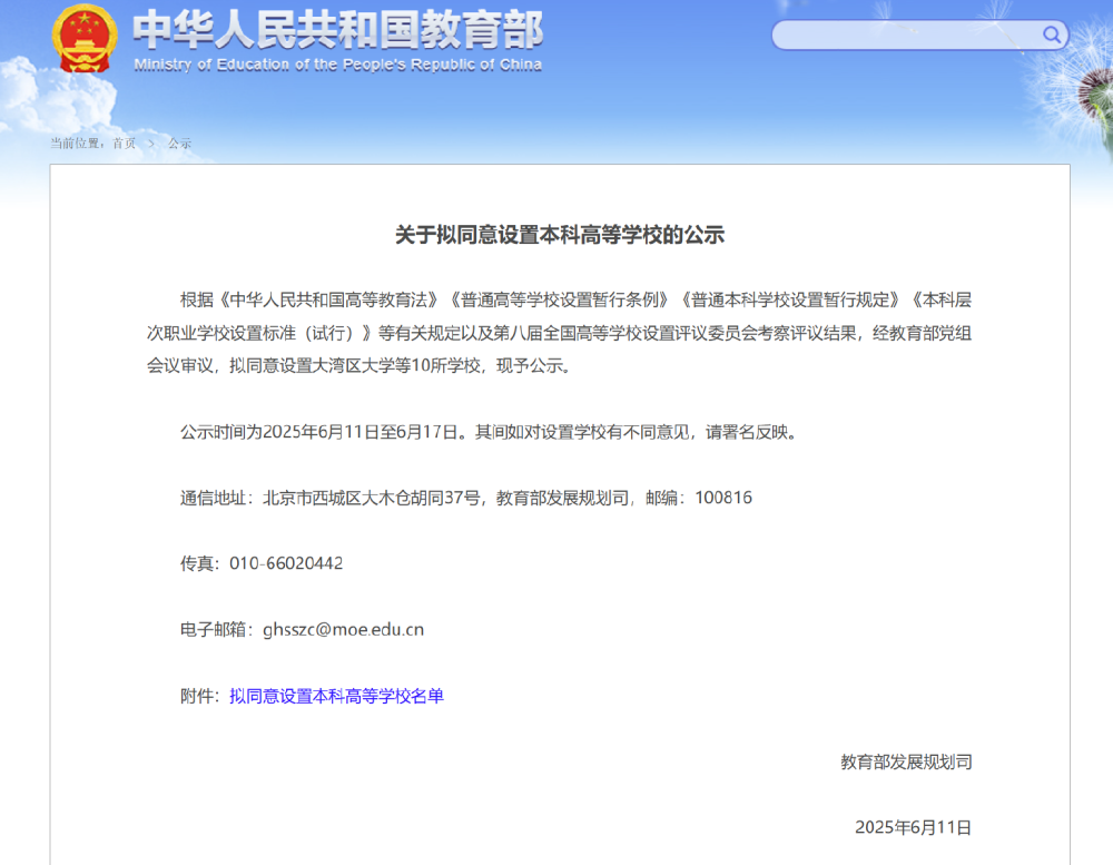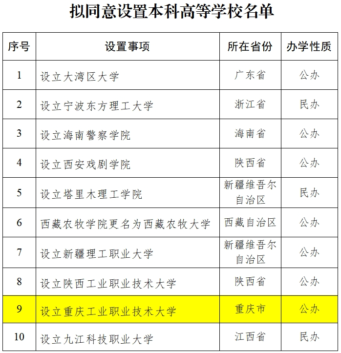 6月11日,教育部消息,拟同意设置本科高等学校10所。目前,正在公示中。