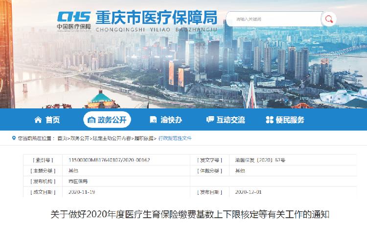 重庆医保微信公众号消息,近日,市医疗保障局市财政局重庆市税务局联合印发《关于做好2020年度医疗生育保险缴费基数上下限核定等有关工作的通知》(渝医保发〔2020〕67号)。