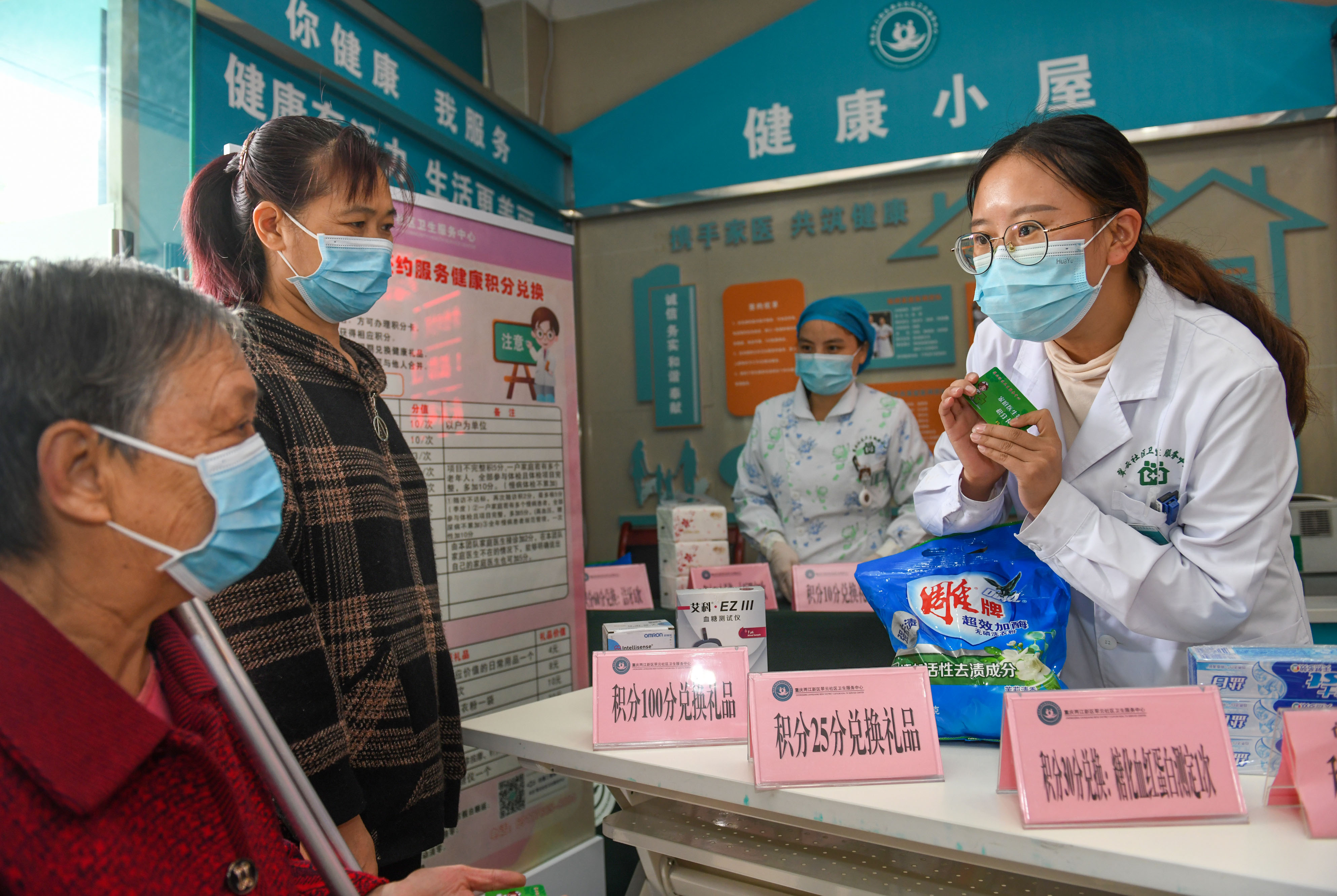 ▲2021年11月1日,在两江新区翠云社区卫生服务中心,几名居民正在使用“家庭医生签约积分卡”兑换物品和医疗服务。记者 张锦辉 摄/视觉重庆