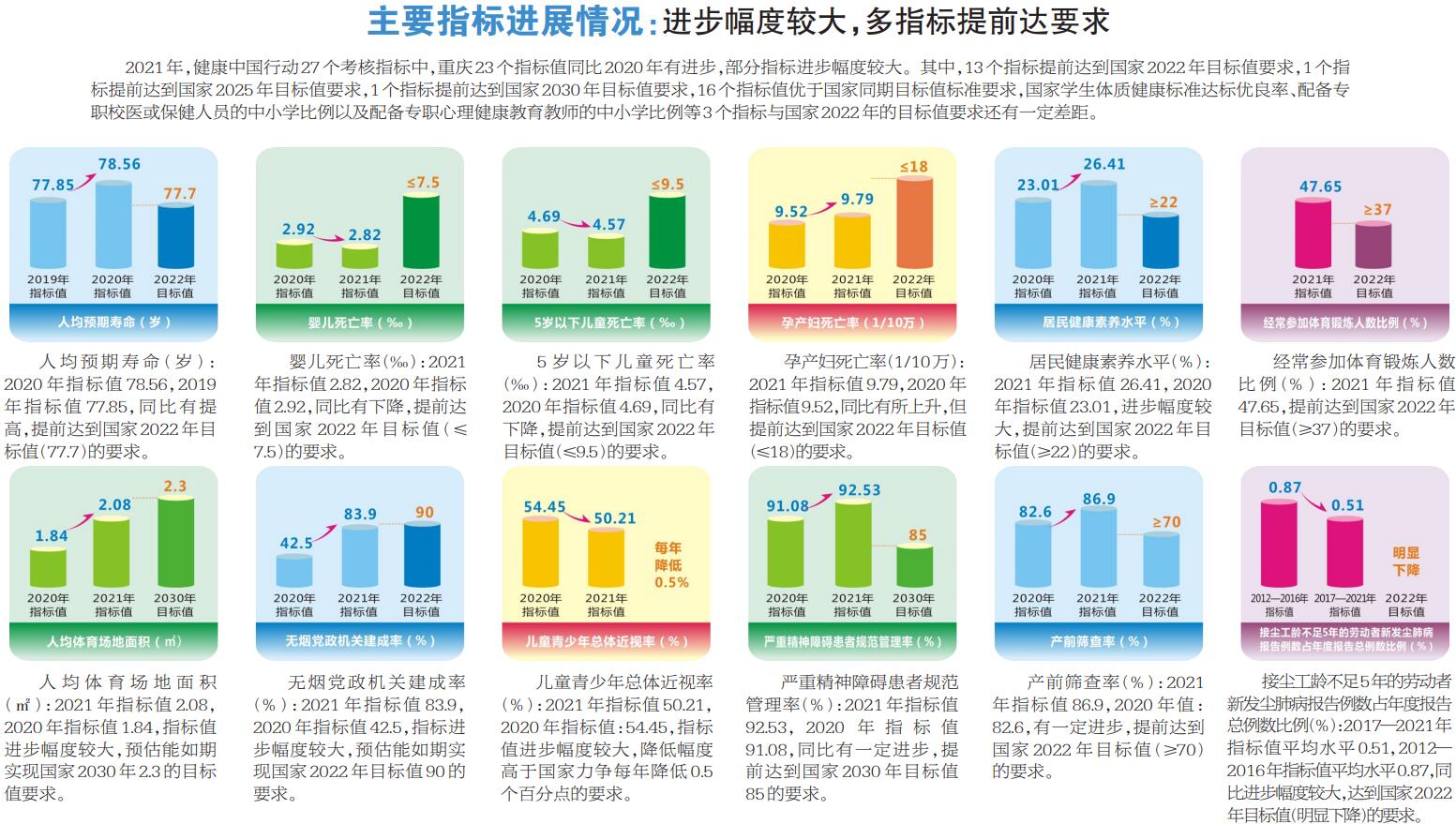 2021年,健康中国行动27个考核指标中,重庆23个指标值同比2020年有进步,部分指标进步幅度较大。其中,13个指标提前达到国家2022年目标值要求,1个指标提前达到国家2025年目标值要求,1个指标提前达到国家2030年目标值要求,16个指标值优于国家同期目标值标准要求,国家学生体质健康标准达标优良率、配备专职校医或保健人员的中小学比例以及配备专职心理健康教育教师的中小学比例等3个指标与国家2022年的目标值要求还有一定差距。