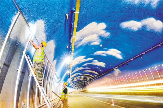 6月5日,位于巴南区的龙洲湾隧道工程,工人正在“蓝天白云”下的1号隧道右洞进行装饰作业。