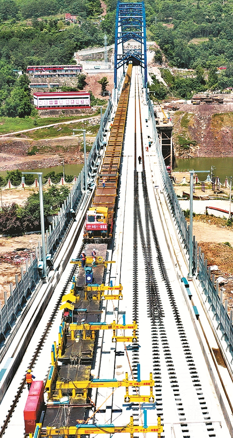 2021年6月5日11时,重庆云阳县,随着最后一根500米钢轨放入预定卡位,标志着郑万彭溪河多线特大桥铺轨完成。现场来自全国的200余名铁路建设者见证了这一历史性的一幕,紧张施工了四年的彭溪河多线特大桥建设宣告结束,为郑万高铁建成通车奠定了坚实基础。该工程创造了两项中国之最:国内最高的冲桩平台之一,栈桥平台至河床底45米高;作为施工支撑平台的钢吊箱高30.9米,也是目前国内吃水最深的钢吊箱之一。 据了解,郑万高铁预计2022年全线建成通车,届时将实现京郑渝昆高速铁路全线贯通,并与京广、陇海、兰渝等铁路大通道联网,极大地缩短重庆及三峡库区与西南、西北、华中、华北等地的时空距离,重庆坐火车到北京只需要6小时。