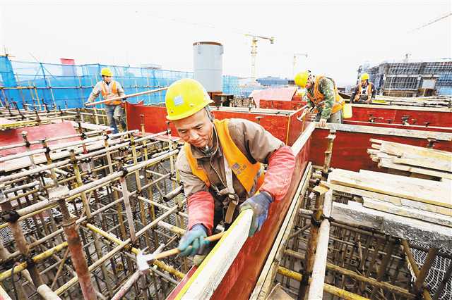 林勇告诉重庆日报记者,最近几天天气有些寒冷,清晨在数米高的“钢筋森林”上安装木板,偶尔还看得见霜。不过,几天工作下来,大家逐渐适应了清冷的作业环境,工作起来越发得心应手。“等我们把大厅一层木板铺好后,钢筋工会在上面绑扎钢筋,接下来就是混凝土浇筑。”他笑着说。