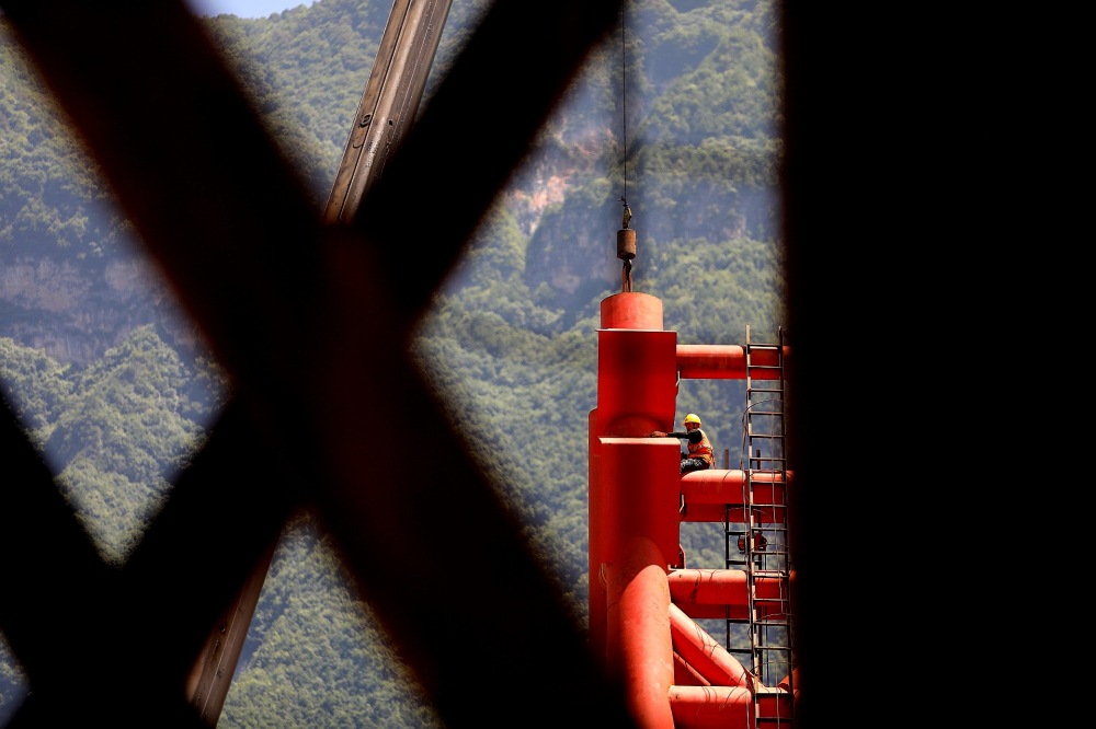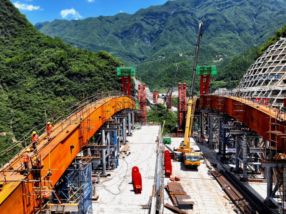 2022年7月11日,城开高速蓼子特大桥施工现场,中国交建的技术工人正在紧张施工,为下月实现“空中转体”做最后的准备工作。蓼子特大桥是城开高速控制性工程,全长约330.8米,为单拱大桥,主跨252米,一端连着蓼子互通,一端连着长湾大桥。