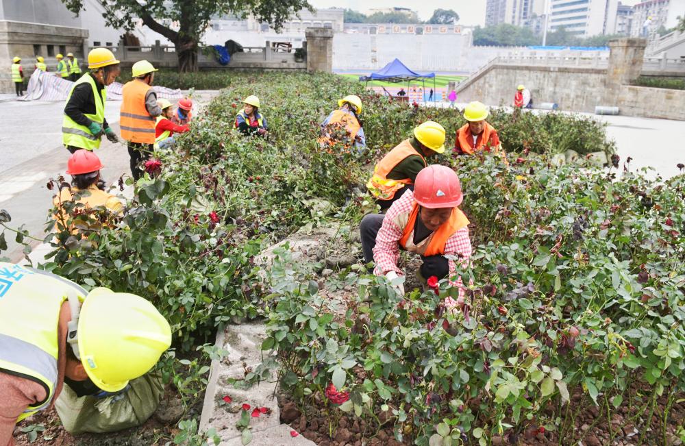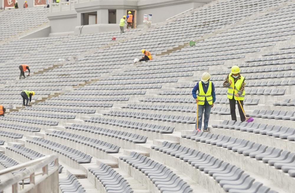 2022年10月26日,渝中区大田湾体育场保护与利用工程现场,工人正在清理看台。
