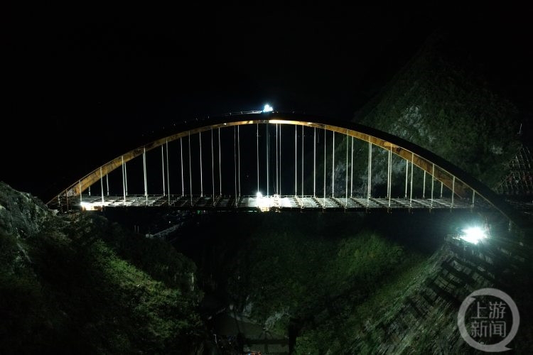 据重庆高速集团工程顾问有限公司负责人介绍,桥面钢梁采用自主研发的负载式可行走拱上吊机进行整体式吊装施工,标志着国内钢拱桥首创负载行走拱上吊机技术成功实施,开创了全新的钢拱桥桥面吊装施工工艺。与传统缆索吊装方式比,施工更加高效,对同类型桥梁施工有重要的技术指导价值。