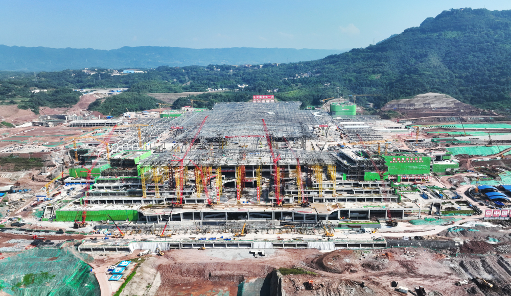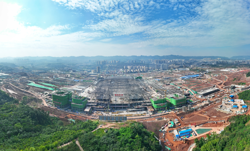 10月15日,南岸区茶园,以"山水千里,黄桷参天"为设计理念的重庆东站站房及配套综合交通枢纽经参建职工加班加点施工,目前整体高铁枢纽雏形轮廓展现,吸引了一些市民前来一睹为快。