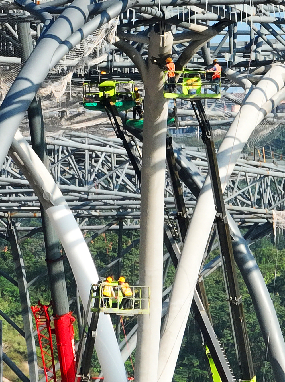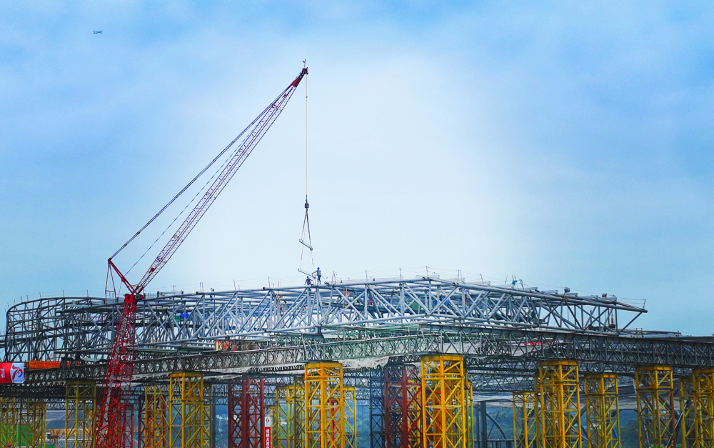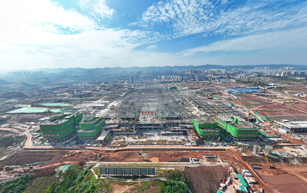 据了解,备受瞩目的重庆东站工程目前已进入站房及配套综合交通枢纽施工阶段,中铁建工等单位职工放弃节假日休息,铆足干劲加紧施工,力争今年底完成一标段金属屋面施工目标,为实现2025年全面建成通车作贡献。