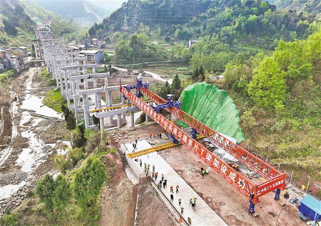 寨子坡大桥位于开州区南门镇三道河村。中铁二十五局万开达高速公路项目一工区负责人杨胜飞介绍,大桥全长600多米,共22跨,需要架设T梁210片。接下来,大桥有望每天以3到5片的架设速度向前推进,预计5月底就可完成全部架梁施工。