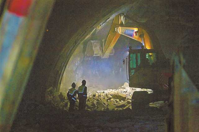 2月23日,白市驿隧道项目第一期工程第一标段项目施工现场,挖掘机正在隧道内有序施工。
