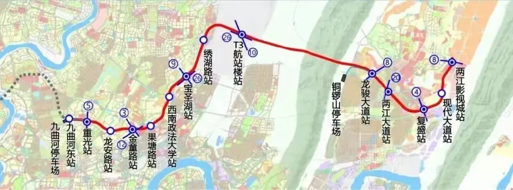 一期工程起于九曲河东站,止于两江影视城站,长约39公里,设站14座,均为地下站,其中换乘站8座。